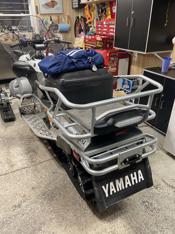 The sled has a great rear rack and a removable 2-up seat for even more carrying capacity while riding solo. Dad set up his machine to use a small action packer with the 2-up seat installed or a larger one with it removed. He also found a great deal on a Yamaha Accessory lockable storage box which is handy for trail riding.
