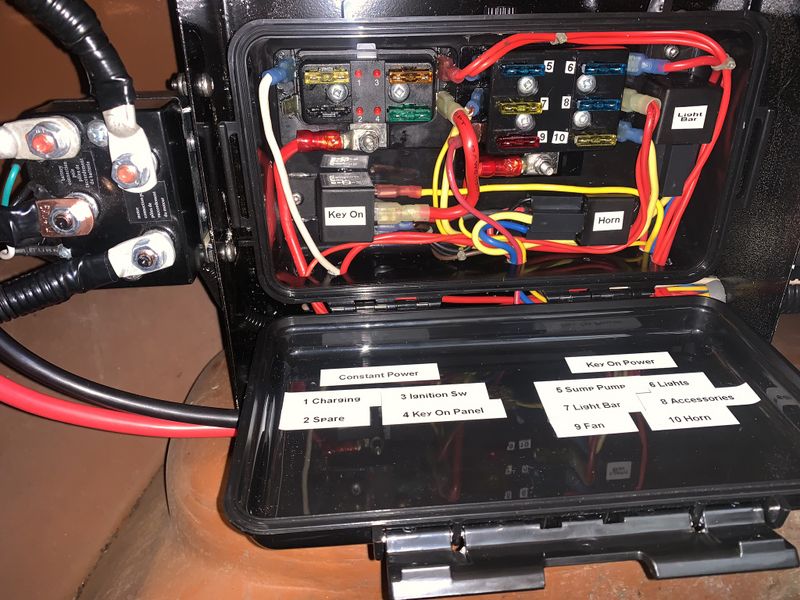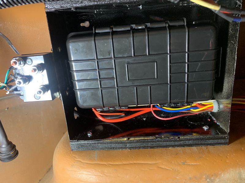 The fuse panels & relays were mounted in a locking plastic weather resistant enclosure which I riveted inside an old alarm panel. This provided structural support and a place to mount the winch contactor.