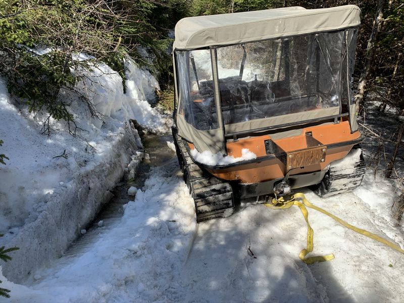 Conditions were beautiful with sunny skies and temps hovering around 10șC. Snow was sugary in consistency but quite sticky in the afternoon sun which helped keep the machine from sliding around more than it normally would have in these conditions.