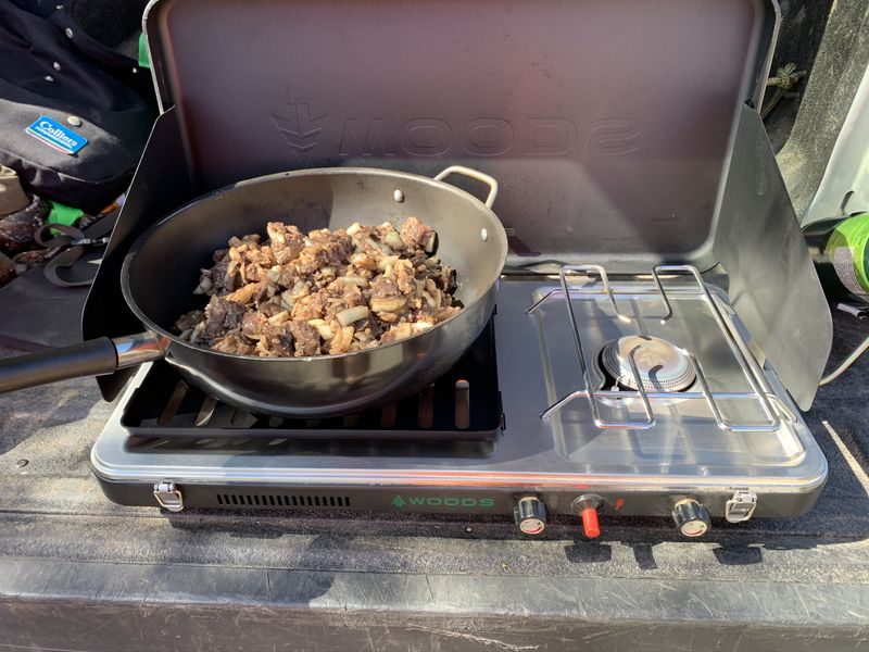 On the menu today was my specialty, a marinated moose/onion/fresh mushroom concoction served with French onion rice which was cooked in my Sea to Summit collapsible X-pot. It was a meal fit for a king, especially enjoyable up in the woods.