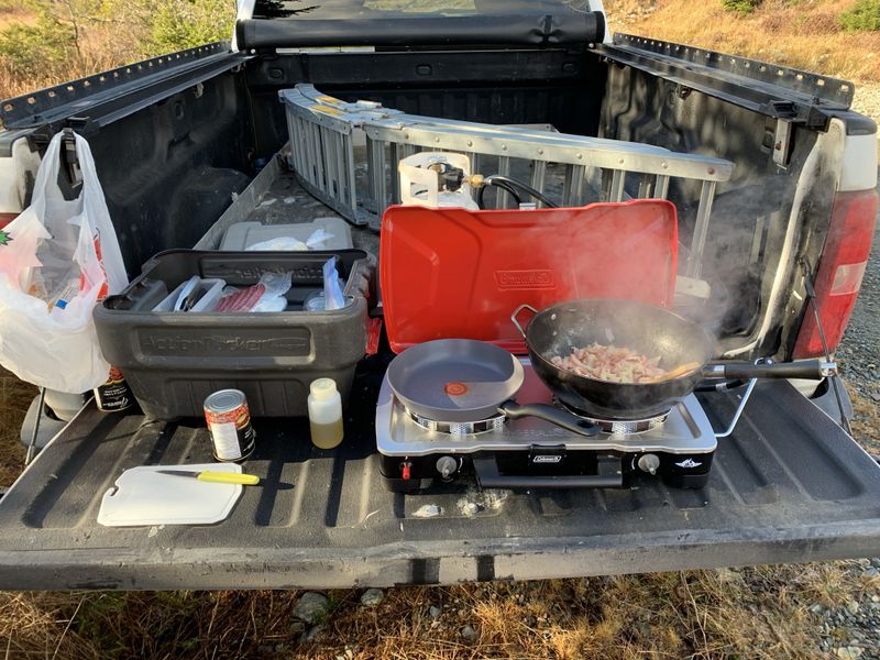 Today I fried up Bacon, onions, beans and a pan full of fresh fish white puddings using my Coleman Hyperflame stove on my tailgate turned countertop.