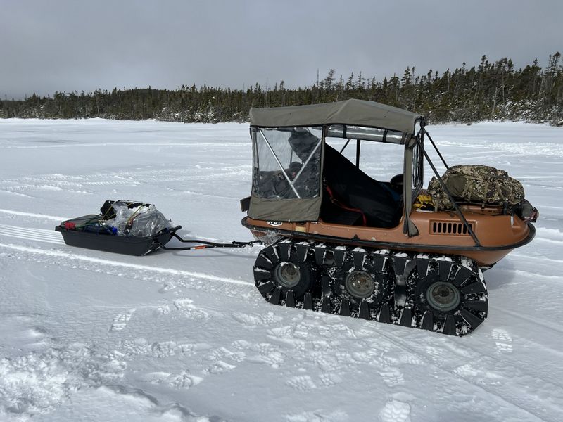 Sunday morning French and I headed back to Bauline, Mark piloted his 2017 Argo Huntmaster while I loaded up Project 6x6 with all of my fishing, cooking and camping gear. I couldn't fit everything I wanted/needed/desired in just the Argo. To solve that problem I picked up a 60" Pelican sled to tow bulky items that were ok to become snow covered on the ride in.