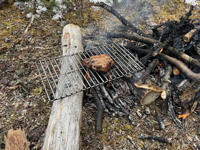 On the menu today was leftover pork chop and Southern Style Coleslaw from last night's barbeque. I reheated the pork chop on my barbeque grate laid over hot coals pulled from the campfire.