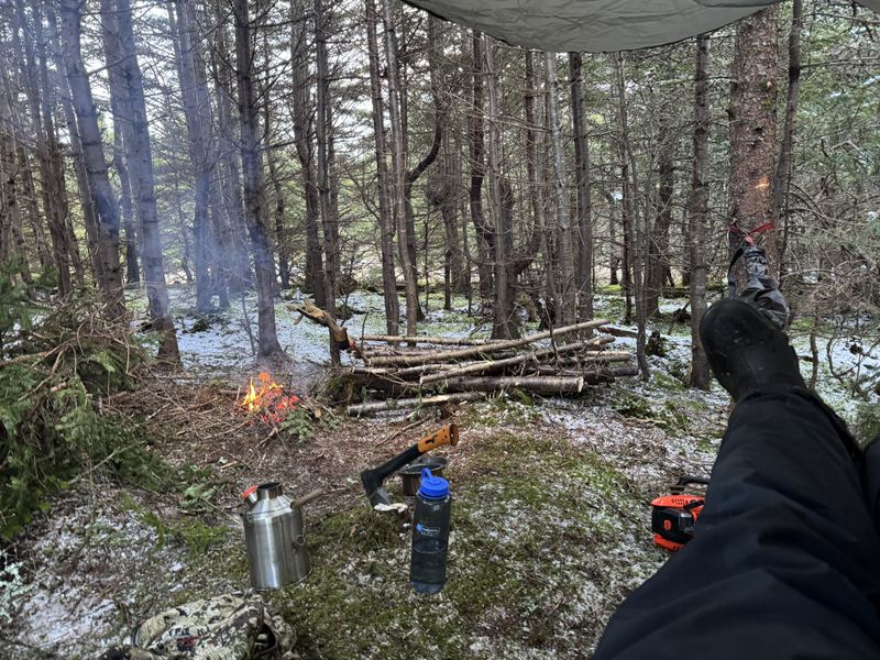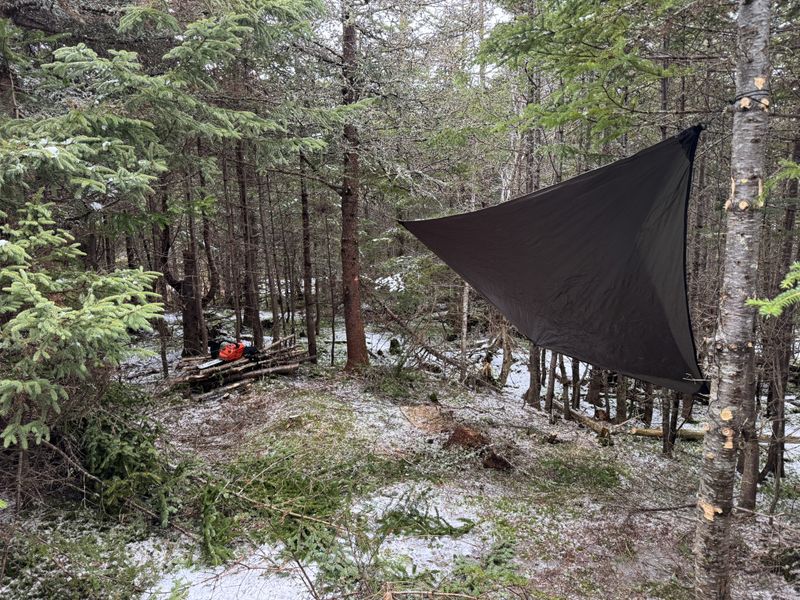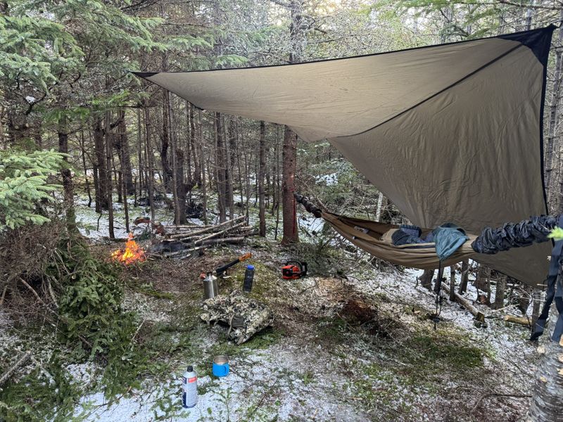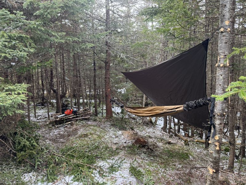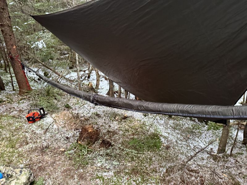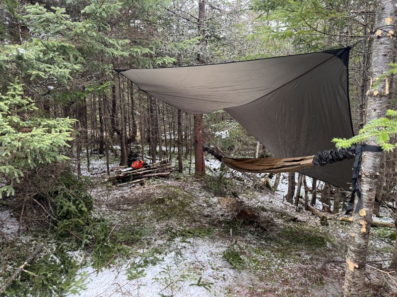 I removed only enough small trees and brush to fit the hammock & have a campfire, leaving the rest to provide protection from the wind & weather. I figured I should do a trial run on my equipment, the first item to go up was my Hennessey Hex Fly which provides protection from rain & Snow.