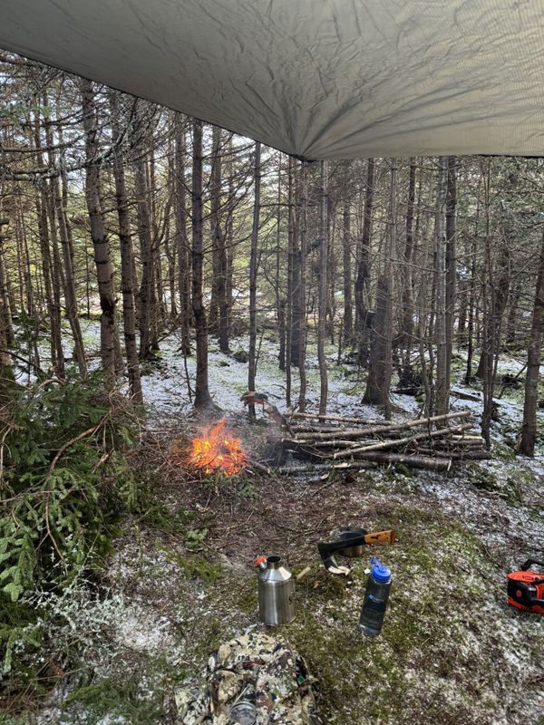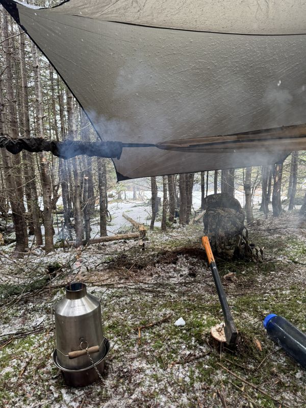 Finally I unfolded the 2nd side of my Hex Fly and tied it off high to create a little roof while I boiled the kettle in a flurry of snow.
