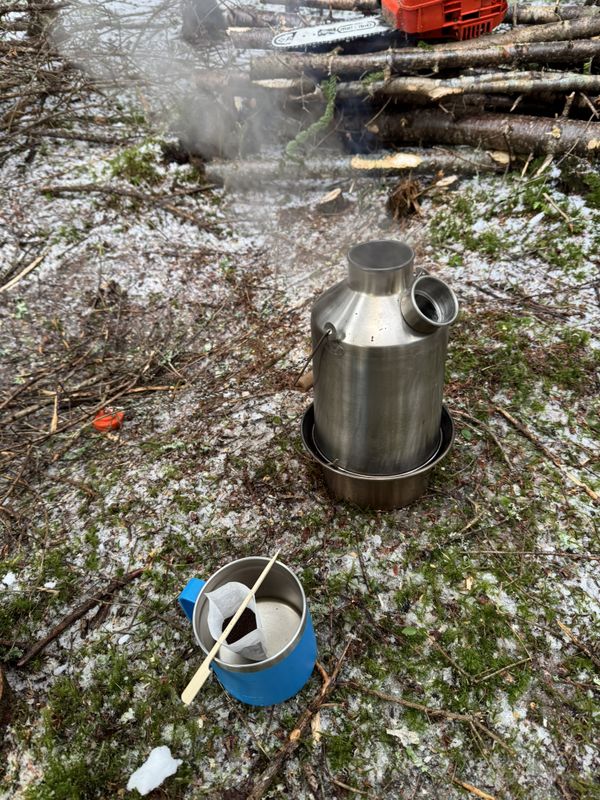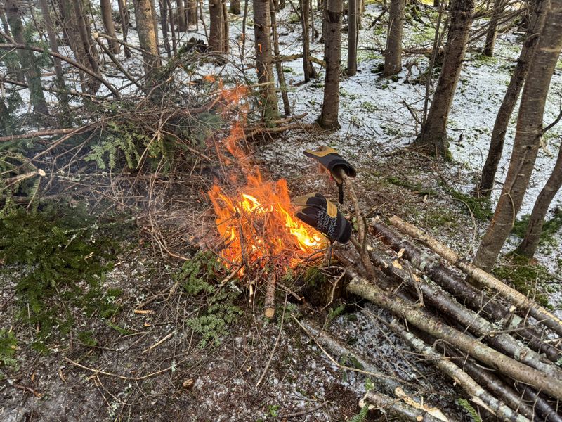 After the kettle was boiled and coffee made I dumped the embers onto a stack of dry firewood to have a little camp fire to warm up and to dry out my damp gloves.