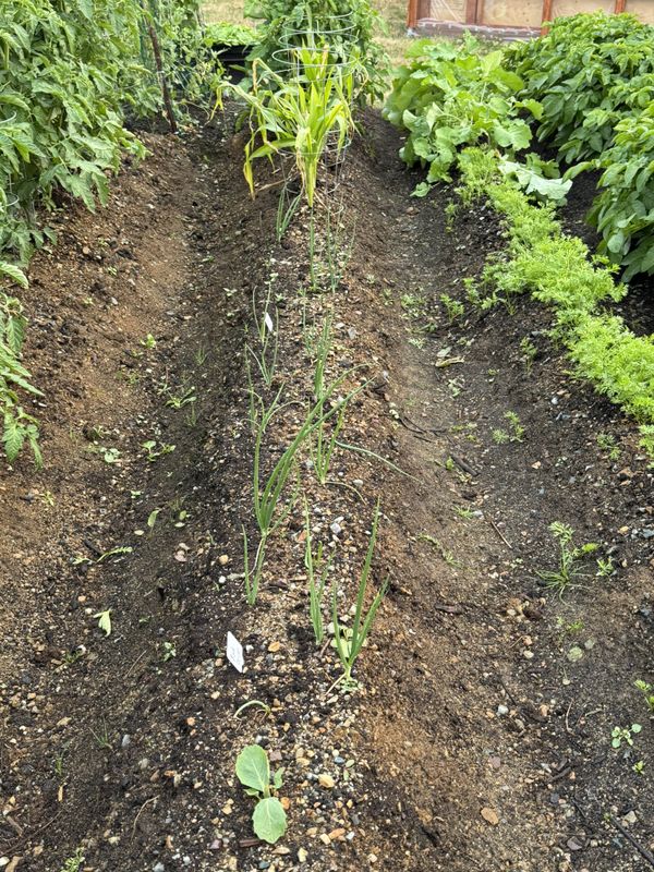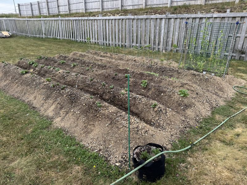 July 4th: Finally the first of our russet potatoes poked their way out of the ground and are joined daily by more and more growth.