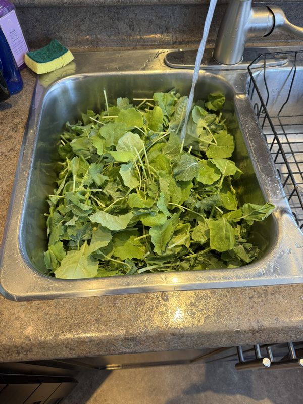 August 13th: One of the first things harvested out of the garden was a first cutting of turnip tops. I picked through them to remove damaged and yellow leaves then stored in bread bags for now.