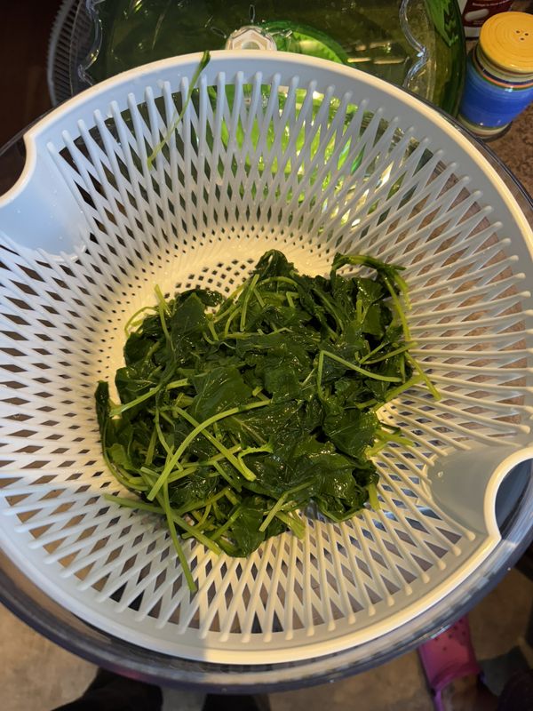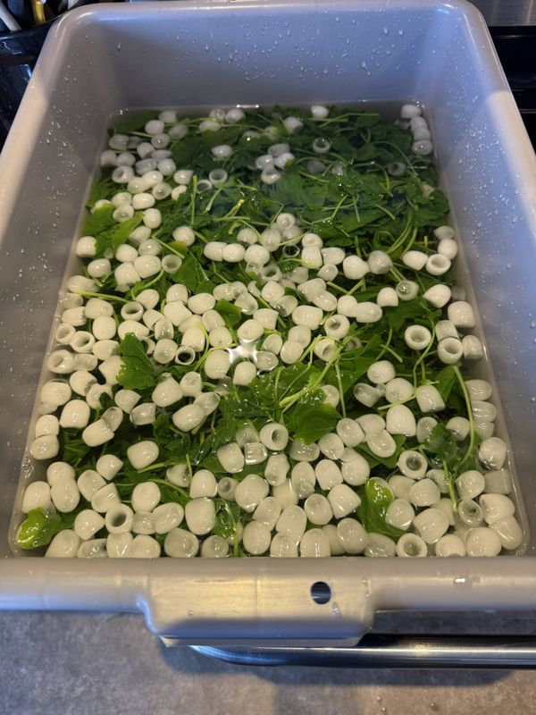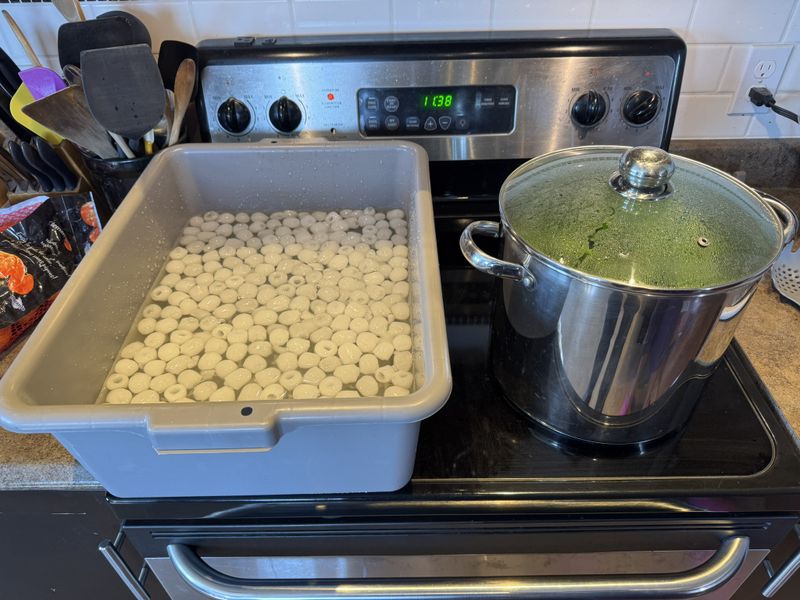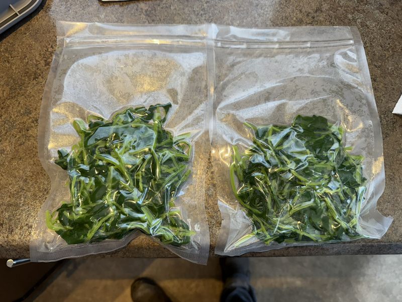 August 17th: Today Sandra and I blanched our turnip tops, which involved par-boiling them, cooling in ice water before straining, vacuum sealing and finally freezing them.