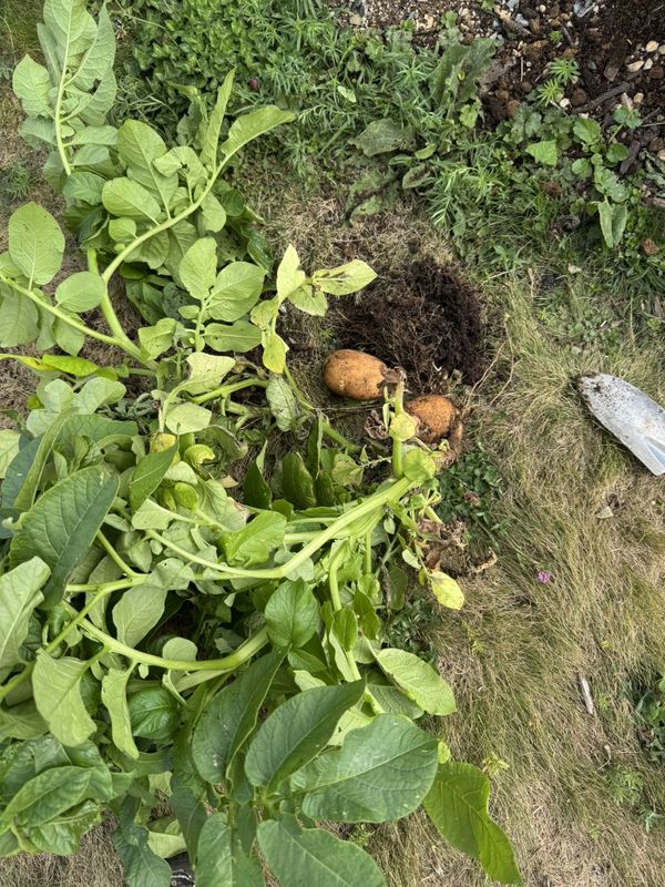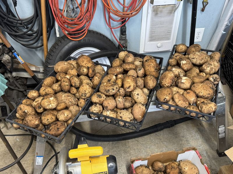 Upon inspecting the garden today we found a critter had bored into one of our potato drills and ruined a few plants. I decided to immediately harvest all of our potato crop and get them drying on racks in the garage before we lost any more.