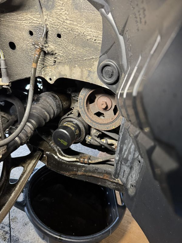 The oil filter was accessed through the passenger side wheel well, having only to turn the wheels all the way to the right and remove a small plastic access cover.
