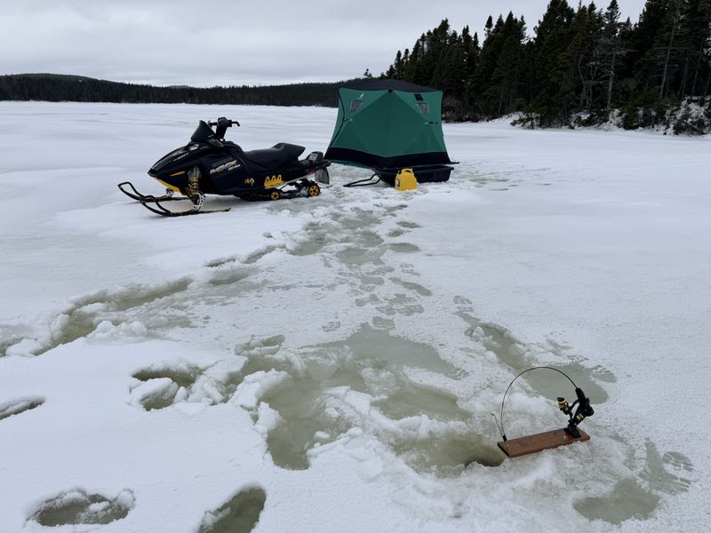 March 6, 2026: Another day on the pond ice fishing with all the necessary equipment including hot tent, grub and the diesel heater!