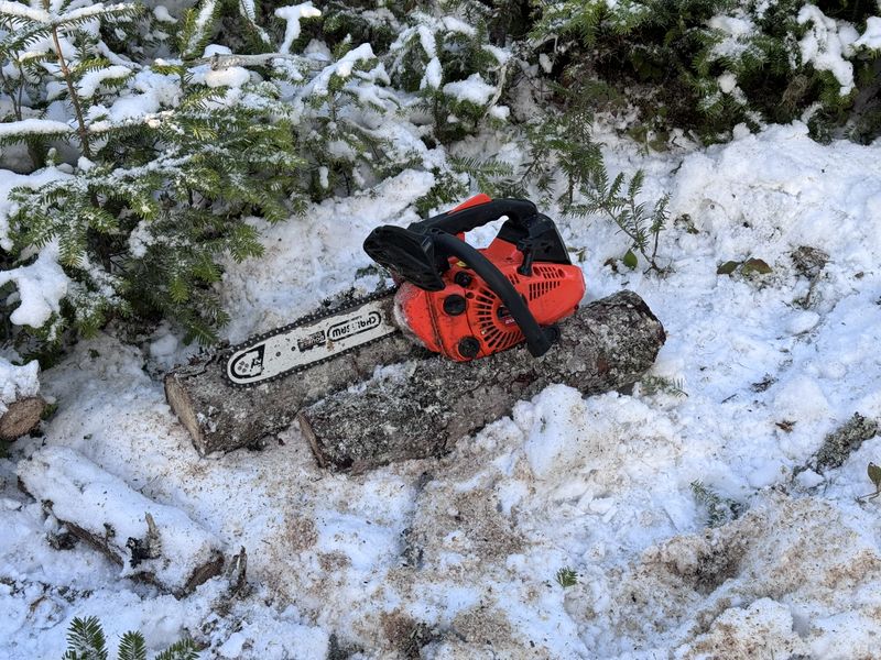 Once again I put my handy CS 2500 mini chainsaw to work dropping a large very rotted out stick to use as a base for the fire keeping it up off the snow followed by a few more sticks to burn to a good bed of coals.