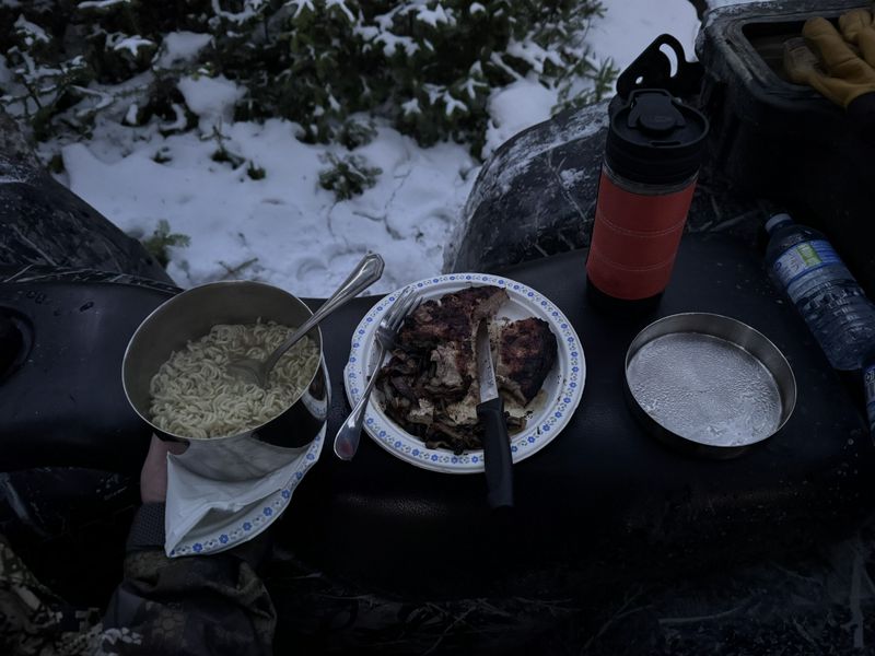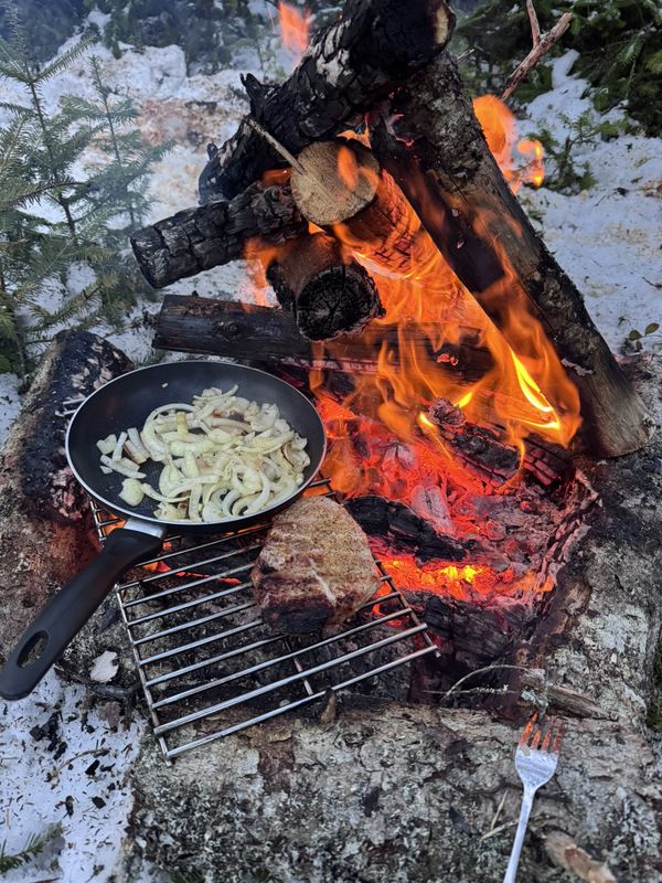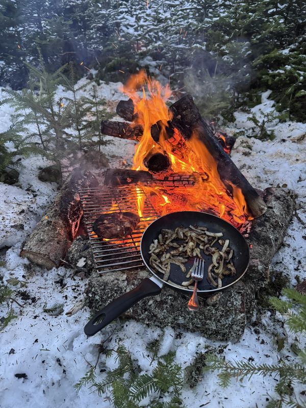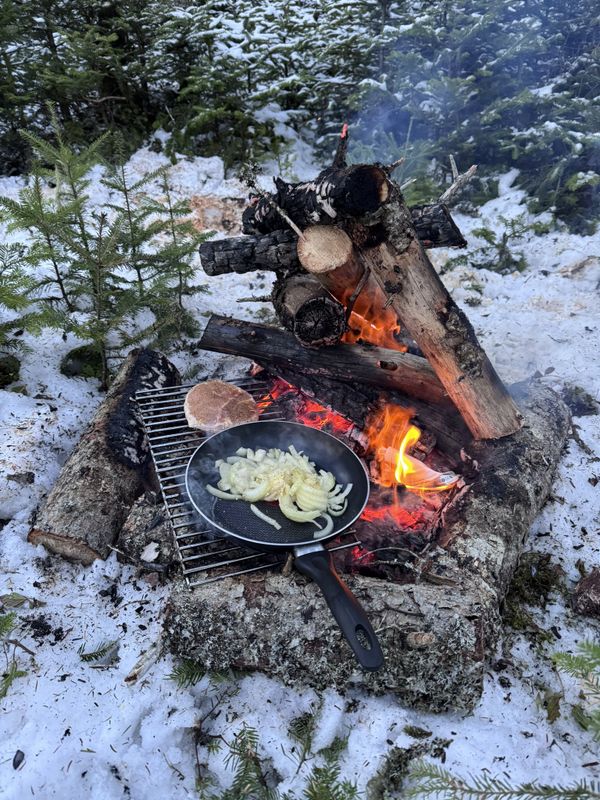 I decided to get a little fancier for my boil-up, of course I will be boiling my Kelly Kettle for coffee in my GSI Commuter java press and to make a pot of Mr. Noodles. Today I added a fresh pork chop grilled over hot coals and a pan of fried onions.