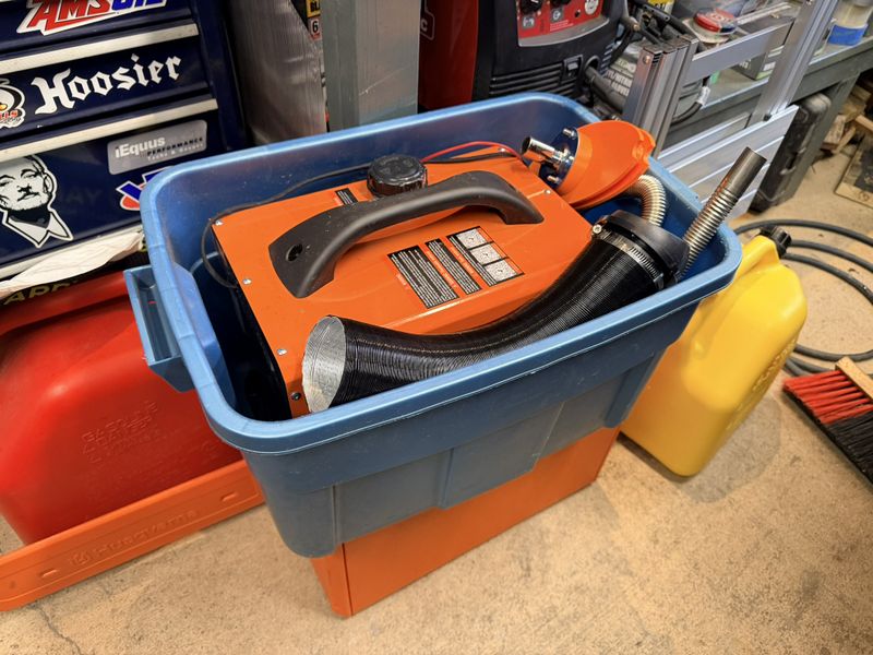 I found this perfectly sized tote in the basement in which to transport the diesel heater and all the piping/accessories that go along with it. This will keep the unit protected during transport and will become a stand on which to lay the heater inside the shelter.