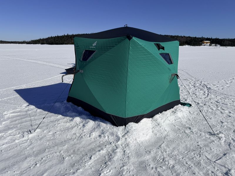 The weather today was sunny but very windy and quite cold at -10ēC plus wind-chill, perfect conditions to justify setting up the Woods Arctic-4 ice fishing shelter! Instead of setting out fishing lines I decided to first set up the shelter and heater so I had a nice wind-free place to bait hooks and assemble the Automatic Hook Setting ice fishing rigs. As it was so incredibly windy, I took the shelter out of the bag then immediately installed one corner anchor screws so it wouldn't blow away down the pond.