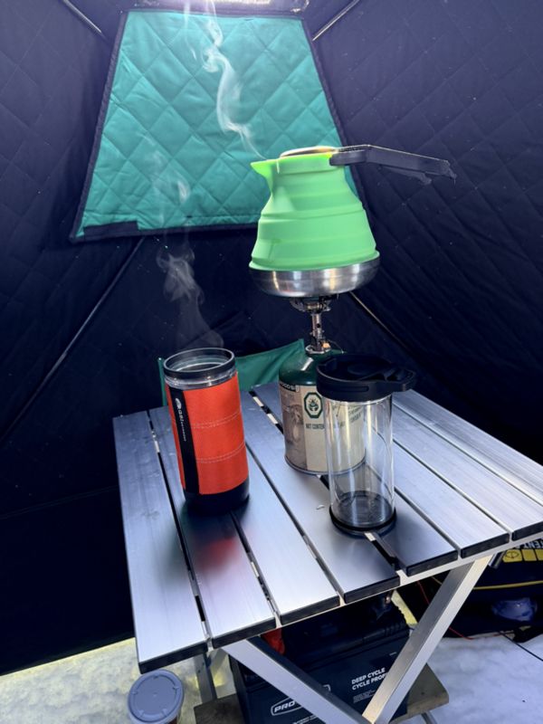 With lines set it was time to retire to the warmth of the shelter and get the Dr.Si collapsible kettle boiling on my GSI Pincacle stove for a cup of fresh brewed coffee in my GSI Commuter coffee press.