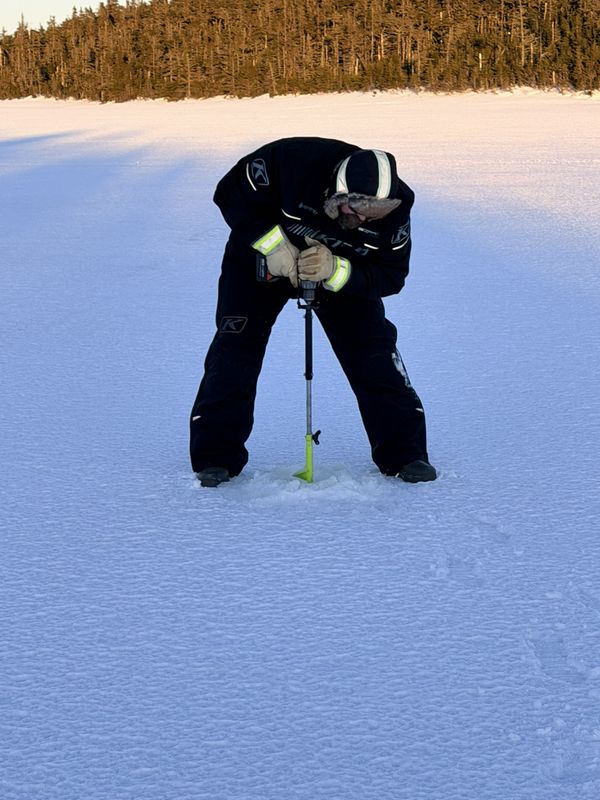 Ice conditions have improved a lot since my last trip. In that time we received some rain plus 100cm of snow. This past week brought strong winds and double digit freezing temperatures which froze all of the old slush, water and slob completely solid. Today the ice auger ate its way through 12" of ice, 3 inches of slush then another 10" of solid clear ice.