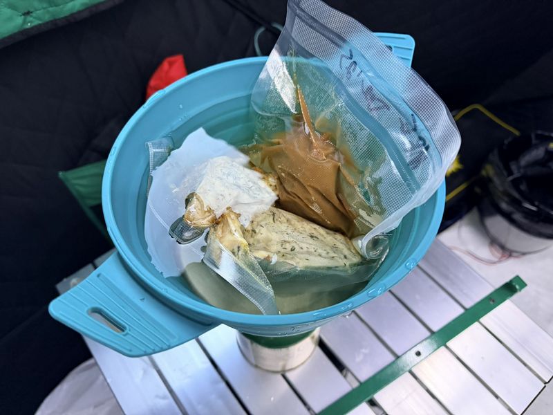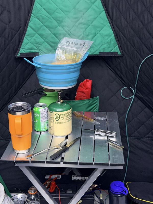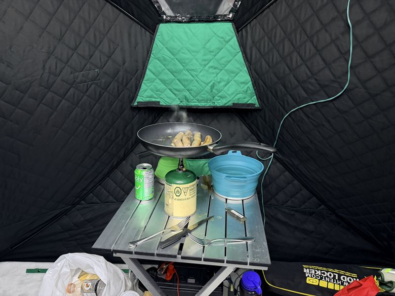With French's lines all set out it was time to retire once again to the warmth of the hot tent, boil the kettle, and start throwing on some grub!