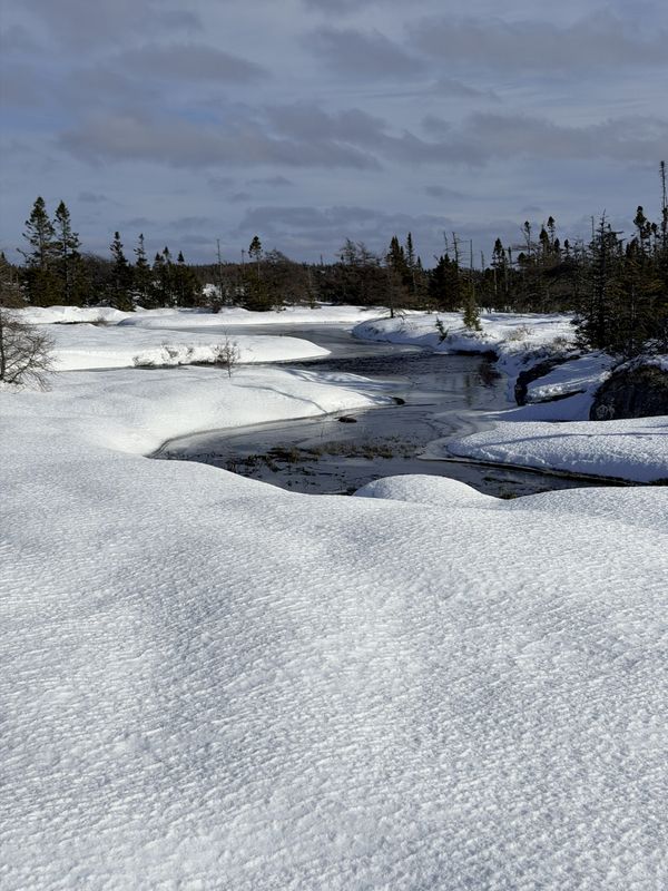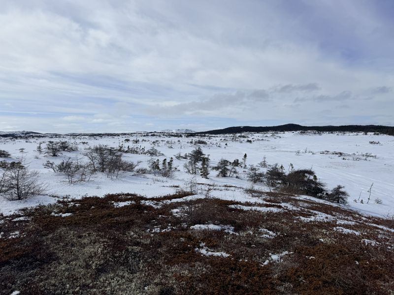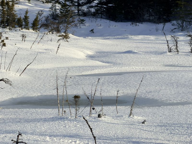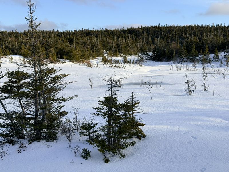 All of the ponds in this area were covered in glare ice, here and there along our journey we jumped off the ponds and ran the Southern Shore Trailway before jumping back onto the barrens.