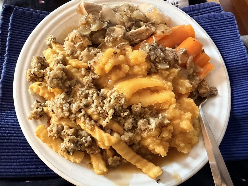 While I cleared, Sandy cooked. On the menu today was a lovely turkey dinner including turnip and carrot from our garden. I don't expect this snow to last very long as it's supposed to rain again Friday. Right now the woods are tangly, brooks and puddles are broke open making for a hard ride on snowmobile, and there's too much snow for the bike right now. Tracks on the Argo would be ideal, but I have one set damaged pretty significantly at the moment. I guess we'll wait and see what the weekend brings!