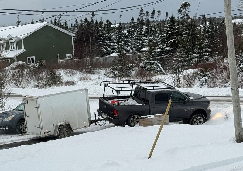 January 6, 2026 Neighbour Dan had a little trouble today manoeuvring his trailer around some parked vehicles. I popped over to lend a hand, first we jacked up the front end and placed some long boards under the frame which had been resting on the concrete culvert. Then after a quick pluck with my Silverado 2500HD and a Kinetic Energy rope we had his truck back on solid ground! Photo Credit: Mike Smith