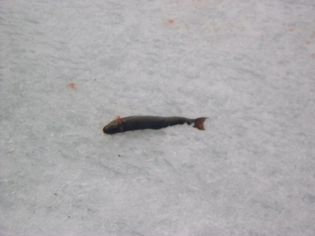 4. This day brought excellent Spring riding conditions consisting of mild weather and crusty snow loosened by the morning sun. Arriving at the pond we bored a few holes and started catching a few trout.